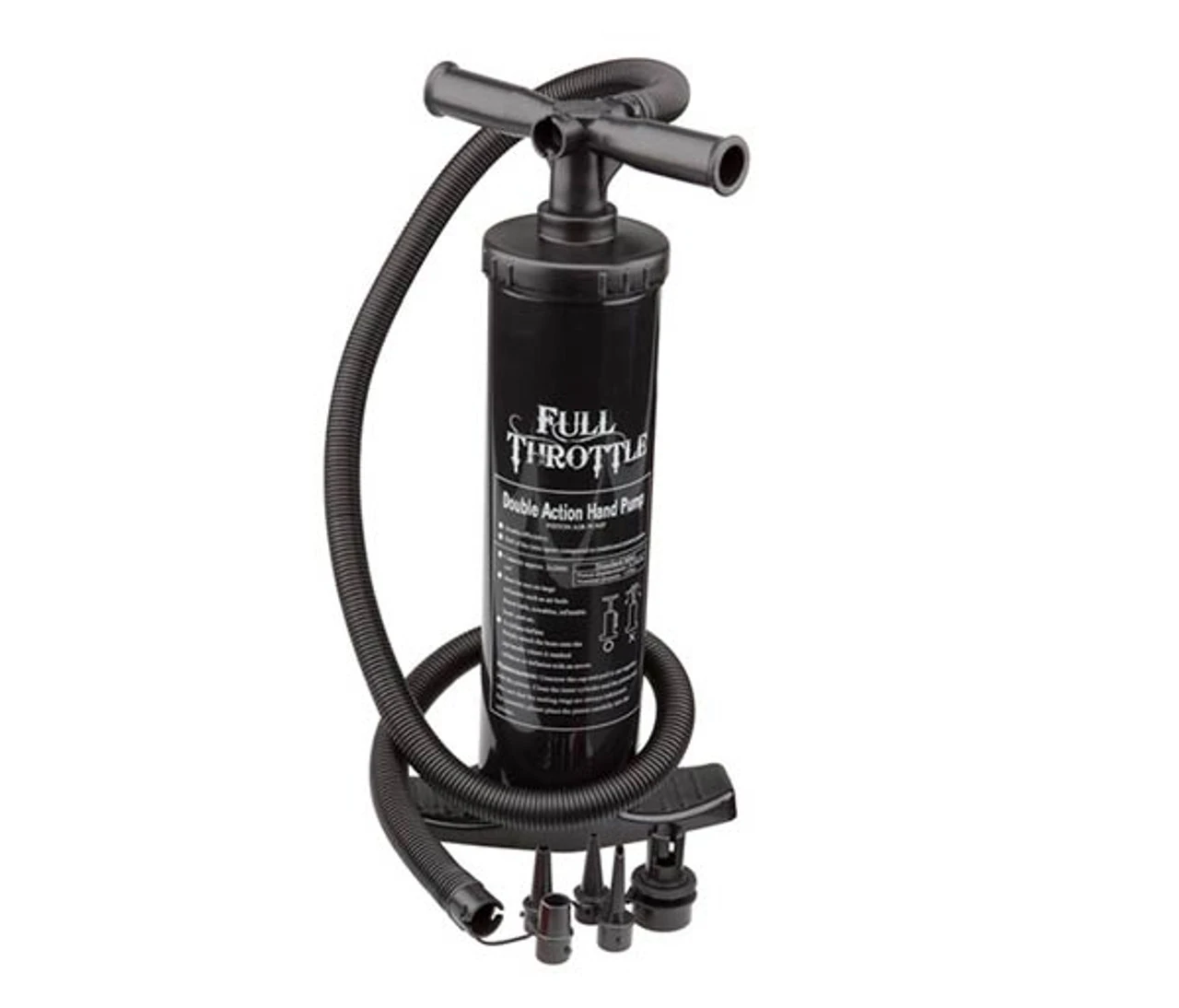 Full Throttle Double Action Hand Pump is an air pump ideally suited for inflating rafts, float tubes and other personal watercraft. The double action design pumps air on both up and down stroke to make inflation twice as fast. Full Throttle includes universal adaptors to fit various valves allowing users to fill a number of different personal watercraft. The package also includes hose wrap to keep hose and adaptors conveniently attached. Inflates up to 14 PSI Great for inflating towable tubes, inflatable boats, air beds, air mattresses, pool and beach toys.