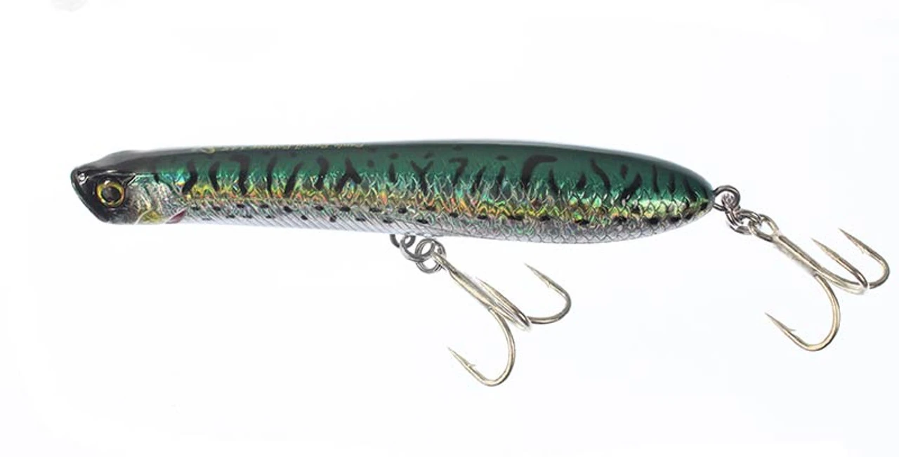 The Panic Pencil Popper’s large rear rattle not only generates a loud rattling sound but acts as a weight-transfer system that ensures extreme long-distance casting even into stiff winds. The Pencil moves with an enticingly erratic action that pulls fish to the surface and provokes them to strike. Its “stepped-hull” design draws air in along the plug’s sides to its underside, generating bubbles that signal a visual cue of feeding activity without increasing lure’s drag and causing angler fatigue. With thru-wire construction, triple split rings and 4X hooks, this plug is built to handle the most brutal saltwater gamefish species.